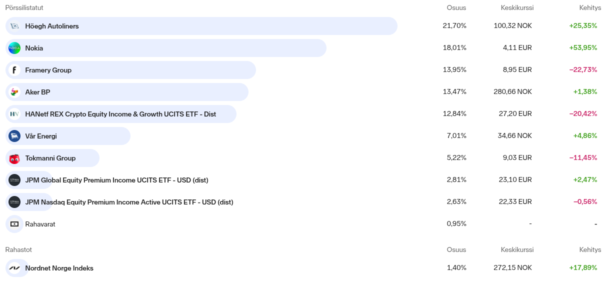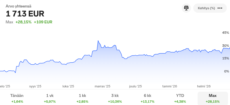 Sijoittamisen olen aloittanut elokuussa 2025, mutta sain siihen vauhtia vasta tammikuussa 2026. Salkkuni on Nordnetissä.